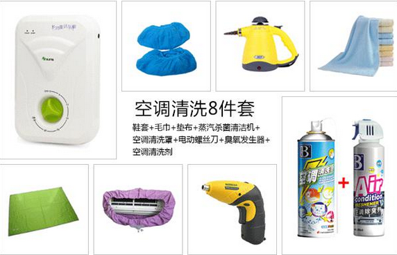 空調清洗8件套,包括:鞋套、毛巾、墊布、蒸汽殺菌清潔機、空調清洗罩、電動螺絲刀、臭氧發(fā)生器和空調清洗劑。